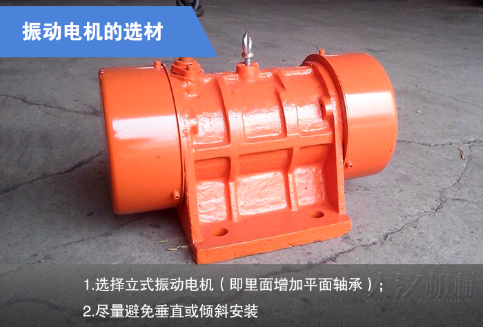 在選材上,盡量使用殼座一體的振動電機(即地腳面在機殼上),因地腳面是一次加工而成,故能保證其水平。而殼座異體(即地腳面在兩端端蓋上),因地腳面是分次加工,再組裝而成,由于裝配誤差的存在,不易保證其地腳面的水平,這樣幾地腳螺栓的受力就不易均勻,而受力較大的一螺栓就容易松動,進而引起其它螺栓的松動、斷裂,燒毀電機。因為振動電機兩端裝有較重的偏心塊,如垂直或傾斜安裝(即轉軸垂直或傾斜水平面),則軸承軸向要承受偏心塊的重力。如果振動電機里無特殊裝置(即平面軸承),將對軸承產生不良影響,從而縮短使用壽命。